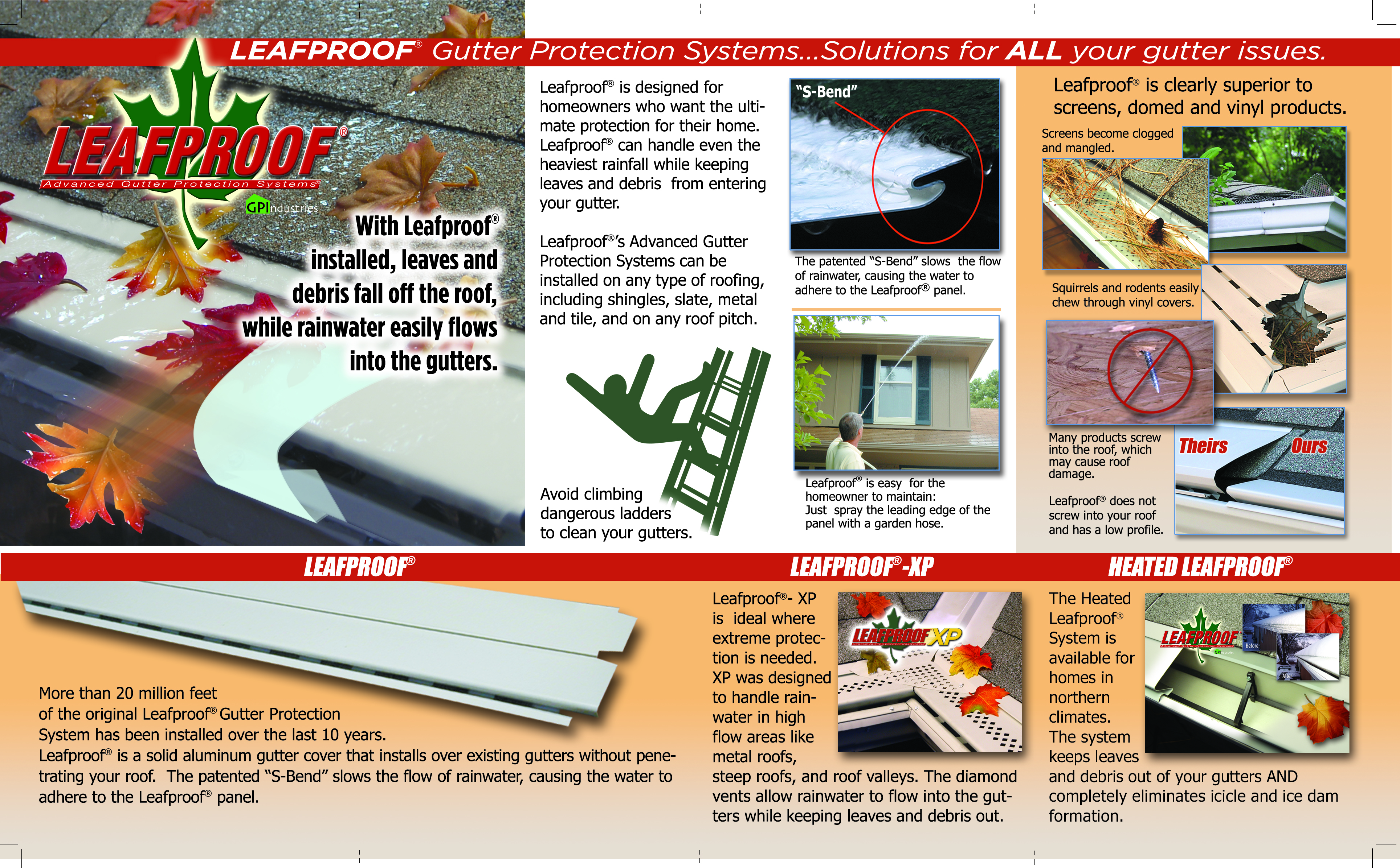 - Leafproof® is a multi-patented product that fits your existing gutters, is installed under the first row of roof shingles, can handle ANY downpour, blends with your gutters and roofline.